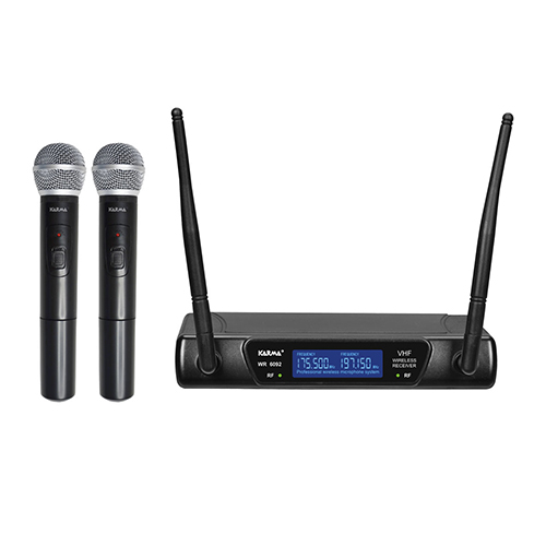 Doppio radiomicrofono VHF comprensivo di una base ricevente e 2 microfoni trasmittenti "a gelato". Sul pannello frontale un display retroilluminato segnala la corretta alimentazione la ricezione del segnale inviato dal radiomicrofono e le frequenze operative. Sul retro sono presenti, oltre al tasto di accensione e alla presa di alimentazione, una doppia uscita Jack 6,3mm destinata a mixer o amplificatori.