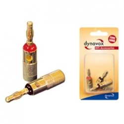 Set 4 spine a banana Dynavox. Spine a banana dorata, con attacco laterale per cavo 6 mm. Per cavi fino a diametro 4 mm. Dimensioni (LxD) 30 x 11 mm. Connessione a saldare. Set composto da 2 spine segnate rosso e 2 spine segnate nero. Confezione in blister.