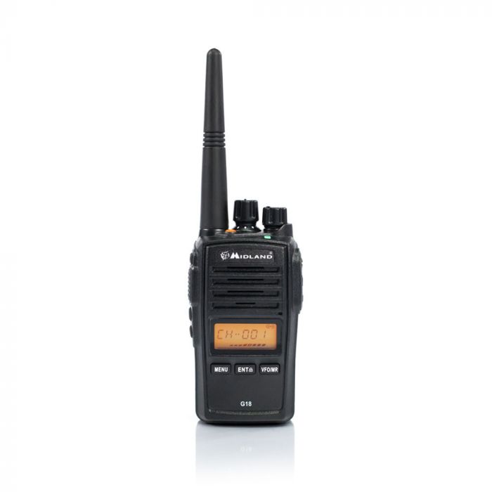 Comunicare, ascoltare musica, farlo in sicurezza, con un audio eccellente e senza preoccuparsi di polvere e pozze d’acqua. Questo è quello che ti garantisce il walkie-talkie Midland G18 che unisce allo chassis in metallo anche il fattore di resistenza IP67 a povere e acqua (fino ad 1 metro di profondita` per 30 minuti), una radio FM e le funzionalità Scrambler e Compander per un'eccellente qualita` audio. Vuoi conoscere anche le altre caratteristiche tecniche? Possiamo iniziare con la potenza d’uscita =500mW ERP e il passo di canalizzazione a 12.5KHz, per poi passare alla scansione canali, alla sintonizzazione vocale e al roger Beep. Ovviamente senza dimenticare la funzione di risparmio batteria, la Squelch e la VOX, o il comodo monitor che si aggiunge, per praticità, al pacco batteria Li-Ion 1600mAh e alla presa accessori a 2 pin tipo MOTOROLA. Il tutto programmabile grazie al software PRG 10 che consente la personalizzazione dei canali e dei subtoni, oltre all’attivazione e disattivazione di funzionalità` specifiche.