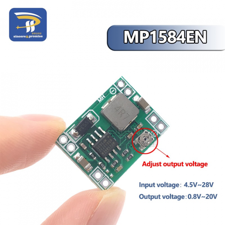 Il mp1584en step-down converter funziona con tensioni di ingresso che vanno da 4.5 a 28 V, leader a qualsiasi valore che si trova nel range di 0.8 - 20 v. La corrente massima che può essere ottenuto in uscita è di 3 A.