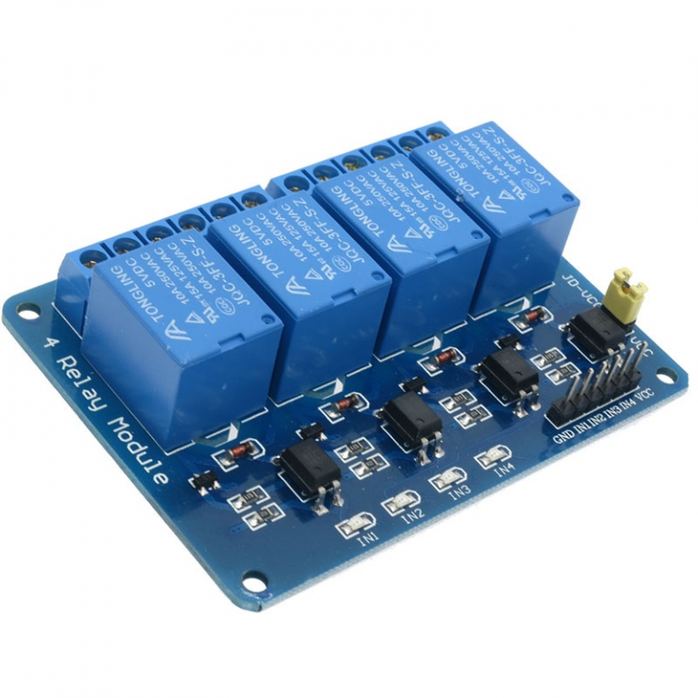 Scheda con 4 relè da 12V con scambio da 10A pilotabile direttamente da Arduino o altri microcontrollori in quanto gli ingressi sono fotoaccoppiati quindi è come pilotare un semplice led. Sulla scheda sono presenti dei comodi morsetti a vite che riportano il contatto pulito dei relè l'attivazione dei relè è segnalata con dei led dedicati. Il ponticello removibile permette di escludere il funzionamento dei relè senza togliere alimentazione alla scheda mentre sul connettore strip line sono presenti l'ingresso per l'alimentazione a 12V e i segnali di comando