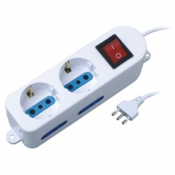 Multipresa 6 posti 4 bipasso/2 schuko con cavo, spina 16 A. Colore: BIANCA. Presa multipla 6 posti, 4 prese da 10/16 A con 2 Schuko con interruttore luminoso. Spina pressofusa 16 A. Lunghezza cavo: 1,5 mt. Potenza derivabile max 2.500 Watt. Sezione cavo d'alimentazione: 3 x 1,0 mm.
