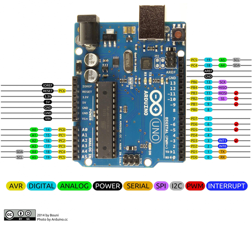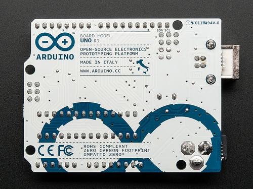 Uno Rev3 è una scheda microcontrollore basata sull'AT mega328 (scheda tecnica). Dispone di 14 pin di ingresso / uscita digitali (di cui 6 utilizzabili come uscite PWM), 6 ingressi analogici, un oscillatore a cristallo da 16 MHz, una connessione USB, un jack di alimentazione, un'intestazione ICSP e un pulsante di ripristino.