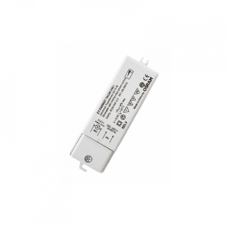 SCHEDA PRODOTTO ET-PARROT 70/220…240 I ET-PARROT | Trasformatori elettronici per lampade ad alogeni a bassissima tensione AREE APPLICATIVE – Illuminazione d'effetto e d'accento – Soggiorni – Illuminazione di oggetti – Sale riunioni – Ristoranti – Apparecchi per mobili per montaggio da incasso o su superficie – Illuminazione di negozi – Sale per eventi __ maggio 30, 2020, 19:53:31 © 2020, prodotti di OSRAM GmbH, distribuiti da LEDVANCE GmbH. Tutti i diritti riservati. ET-PARROT 70/220…240 I Pagina 1 di 4 DATI TECNICI Dati elettrici Potenza di lampada 20…70 W Corrente di alimentazione 0,30 A 1) Fattore di potenza ? 0,95 2) Frequenza di funzionamento 50 kHz 3) Tensione in uscita 11,9 / 12,0 V 4) Tensione nominale 220…240 V Tensione in ingresso 198…264 V Frequenza di rete 50…60 Hz Potenza di sistema 74,00 W Gamma di tensione 220…240 V Numero max di ECG con autom. da 10 A (B) 37 Numero max di ECG con autom. da 16 A (B) 59 Efficienza ECG 95 % 5) Isolamento galvanico primario/secondario 4,00 kV 6) Corrente di innesco 0,45 A