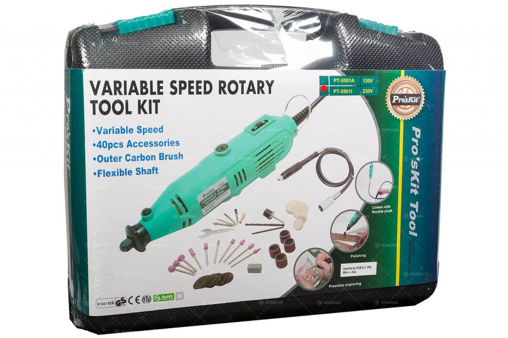 Descrizione: Trapano con mini fresa a velocità variabile, con 40 accessori. Proskit PT-5501I