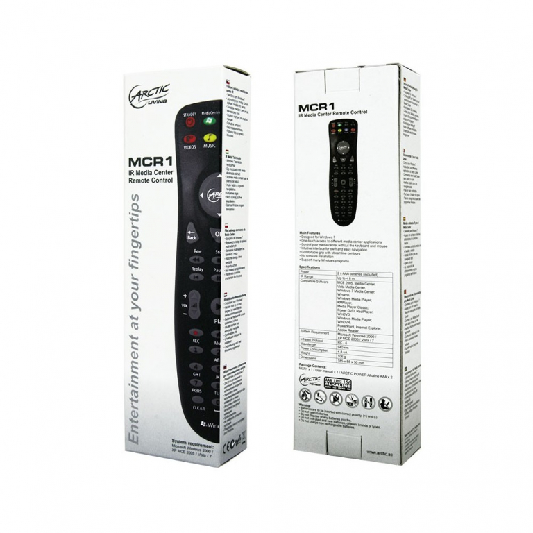 L'Arctic MCR1 un telecomando IR per sistemi Media Center, come ad esempio lArctic MC001. Sul telecomando, dalla forma ergonomica, sono presenti i tasti di accesso rapido a TV, FILM, MUSICA ed IMMAGINI.