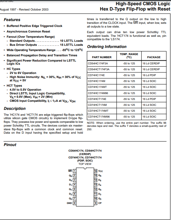 INTEGRATO CD74HC174E High-Speed CMOS Logic Hex D-Type Flip-Flop with Reset