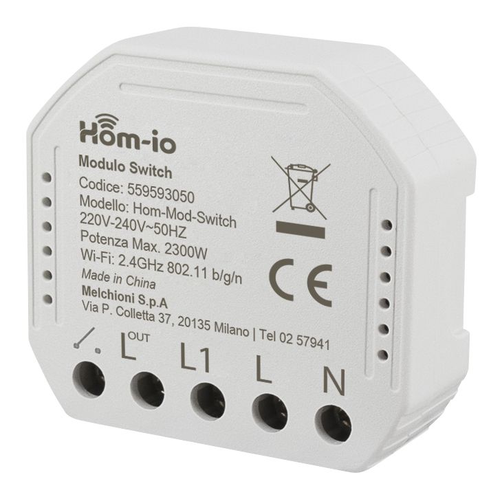 Modulo switch WiFi Hom-io per il controllo di illuminazione e dispositivi. Dotato di contatto pulito permette di pilotare carichi in alta o bassa tensione anche grazie ai 10 Ampere di corrente supportata.