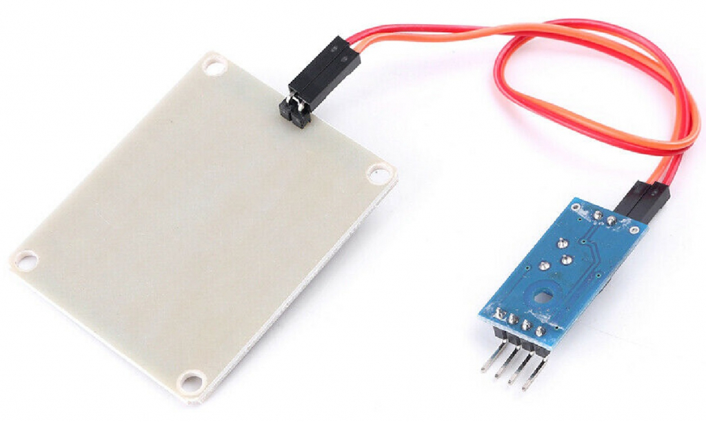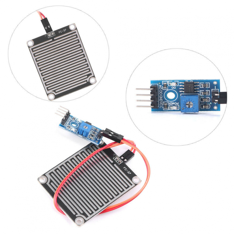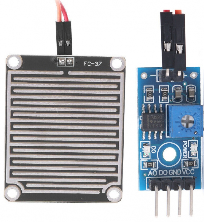 Composto da un basetta con ampia area di rilevamento (34x47 mm) su entrambe le facce ed elettronica di controllo, questo prodotto è particolarmente indicato come rilevatore di pioggia. La sezione elettronica dispone di una uscita analogica, una digitale, un trimmer per regolare la sensibilità d'ingresso e due LED di stato. L'uscita digitale D0 può pilotare direttamente dispositivi con assorbimento massimo di 100 mA come relè, buzzer, piccole ventole, ecc. Quando l'area di rilevamento non è bagnata dalla pioggia, l'uscita digitale D0 è a livello logico alto, quando è bagnata va a livello logico basso. Collegando l'uscita analogica A0 all'ingresso analogico di Arduino è possibile conoscere la quantità di pioggia caduta sul sensore. Alimentazione: 5 Vdc.