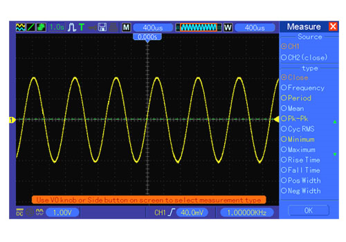 - Cursore di misura: Differenza di tensione tra i cursori: Differenza tra i cursori Delta V / time: Delta T / Reciprocal of Delta T in Hertz (1/Delta T) - Misura Automatica: Frequenza, Periodo, Media, Picco-Picco, Cicli RMS, Minimum, Maximum, Rise time, Fall Time, +Pulse Width, -Pulse Width, Delay1-2Fall, +Duty, -Duty, Vbase, Vtop, Vmid, Vamp, Overshoot, Preshoot, Preiod Mean, Preiod RMS, FOVShoot, RPREShoot, BWIDTH, FRF, FFR, LRR, LRF, LFR, LFF