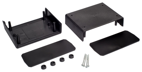 Contenitore in polistirene (C8H8)n con pannelli laterali colore nero.