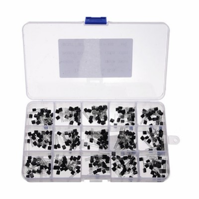 Set composto da una vaschetta plastica richiudibile a 15 scomparti con 300 transistor in TO-92. I transistor sono di 15 differenti modelli sia NPN che PNP. 20 pezzi per ciascun modello.