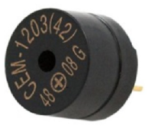 Buzzer da circuito stampato con elettronica, frequenza sonora di 2 kHz, potenza 95 dBA, diametro 12 mm, alimentazione compresa tra 3,5 e 5,5 Vdc e consumo di 35 mA.