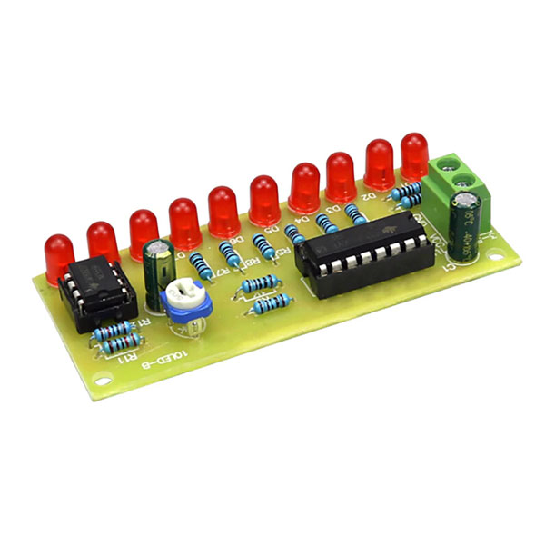 Semplice circuito in kit che permette di far accendere in sequenza 10 LED rossi. La velocità di scorrimento dei LED può essere regolata tramite il trimmer. Alimentazione: da 3 a 5 volt, dimensioni (mm): 73x32x18. Utilizzabile in molteplici applicazioni: giocattoli, modelli radiocomandati, gadget luminosi, ecc.