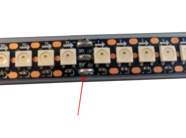 La strip presenta la seguente giuntura a 50 cm, la distanza tra i due LED è leggermente maggiore rispetto a tutti gli altri. |