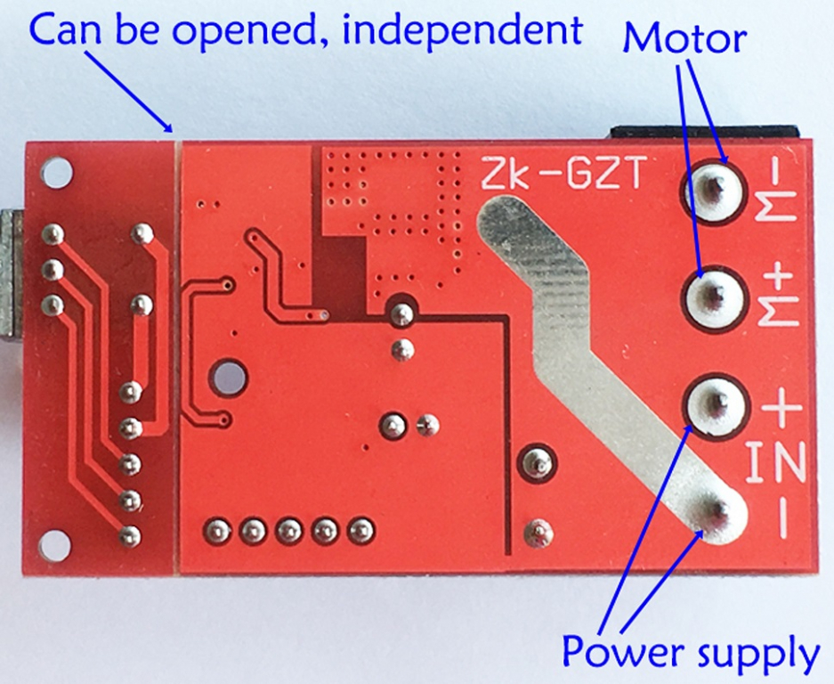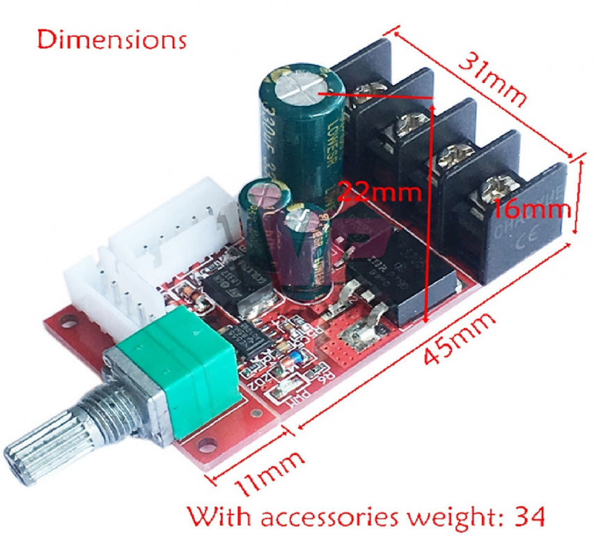 Modulo driver PWM progettato per motori DC, dove la velocità di rotazione si può controllare regolando il segnale PWM tramite il potenziometro incorporato sulla scheda. Il sistema può essere utilizzato anche come dimmer per diodi LED. il potenziometro incorporato è dotato anche di interruttore. Quindi ruotando in senso antiorario si diminuisce il livello di uscita fino a spegnere completamente con l'interruttore. Inoltre il potenziometro si può separare dal modulo e collegare con l'apposito cavetto a 5 poli fornito. La frequenza del segnale di controllo è 20 kHz. D'altra parte, la tensione di alimentazione, che è anche la tensione di esercizio del motore, può essere compresa tra 10 e 50 VDC. La potenza di uscita massima del sistema è di 300W. L'ingresso di alimentazione è protetto da un diodo che fornisce protezione contro il collegamento dell'alimentazione inversa. Il modulo è composto da 2 parti. La scheda controller è prodotta in fabbrica, ma l'utente può separarla in 2 parti: la parte di controllo e la parte con un potenziometro per la regolazione della velocità del motore.