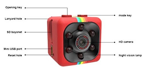 Il prodotto si presenta con una finitura nero-opaco con delle strisce colorate che attraversano tutta la scocca, nella parte frontale troviamo la lente mentre attorno vi sono n.6 LED infrarossi per le riprese notturne. Nella parte posteriore abbiamo una presa Mini USB 8-Pin per la ricarica e visione nella tv attraverso il cavo in dotazione, accanto, vi è lo slot per l’installazione di una Micro SD con una capacità massima di 32GB necessaria per il corretto funzionamento. Nella Zona superiore troviamo n.2 Pulsanti di cui uno per l’accensione e lo spegnimento, mentre l’altro che serve ad impostare la camera nelle 4 possibili configurazioni, accanto invece un piccolo foro indica la presenza di un microfono.