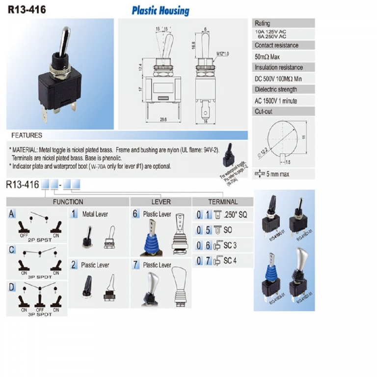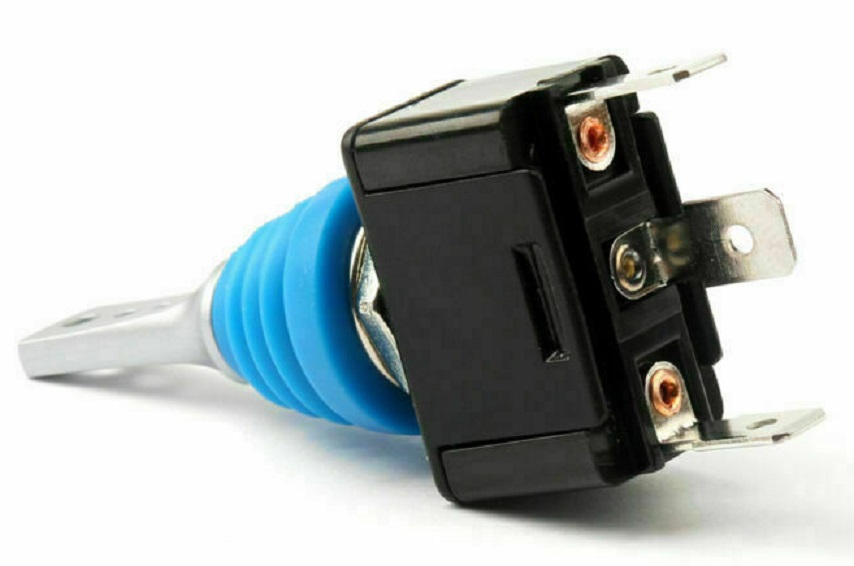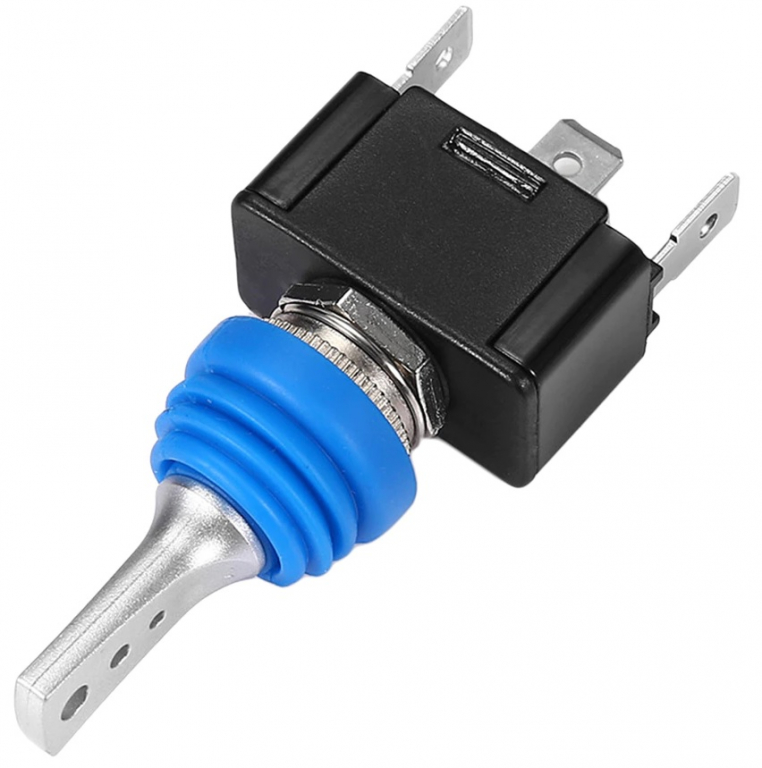 COMMUTATORE ON-OFF-ON SPDT IMPERMEABILE Con copertura in gomma blu che lo rende protetto contro la polvere  e contro i getti d'acqua (IP65)