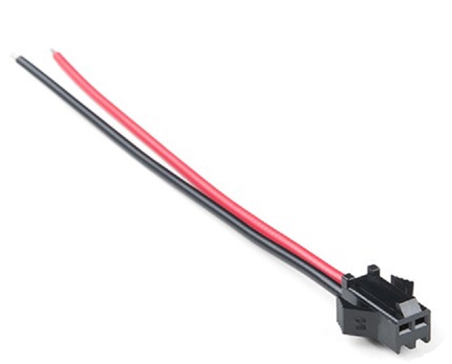 Connettore standard JST SM 2 pin con passo 2,5mm, corredato di 2 cavetti: rosso e nero 22AWG lungo 100mm