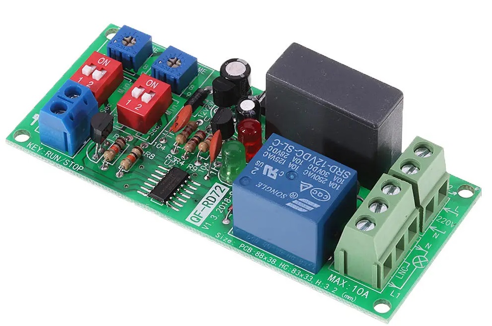 Applicazioni: La scheda avendo la possibilità di regolare in maniera indipendente il tempo di ON e quello di OFF del Relè, può essere utilizzata ad esempio come innaffiatore temporizzato per giardini (esempio attivazione di una elettrovalvola per 5 min, spegnimento per 600 min (per 10 ore) e di nuovo accensione-spegnimento a ciclo infinito). Può essere utilizzata per il controllo di oggetti meccanici con corsa alternativa esempio presse a funzionamento continuo in cicli di produzione, o per il test di invecchiamento dei prodotti es. presse che in continuazione comprimono e rilasciano in modo elettromeccanico le molle di un prodotto finito come può essere un materasso/divano per valutarne la durata ecc