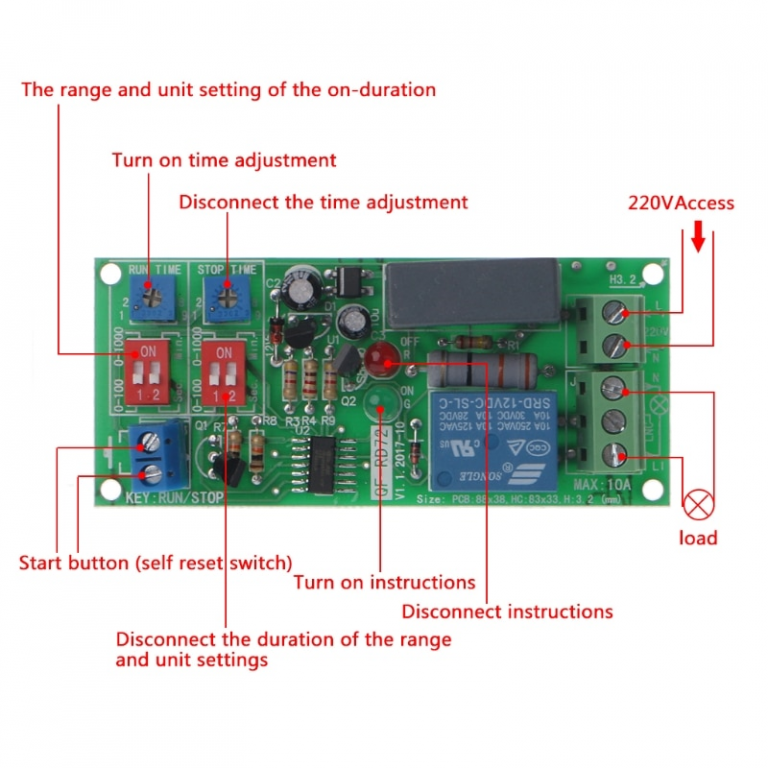 Una volta eseguiti i collegamenti del pulsante, della spina di alimentazione 220V e del carico in uscita sul Relè, collegare il circuito alla 220V e premere una volta il pulsante. L’accensione del led verde, indicherà lo stato di funzionamento in ON e dopo il tempo impostato sul primo trimmer passerà automaticamente allo stato di OFF e vi rimarrà per tutto il tempo impostato con il secondo il trimmer. Il modulo continuerà a funzionare alternando gli stati di ON e di OFF a ciclo infinito. A questo punto, premere nuovamente il pulsante. Il modulo passerà in modalità OFF, il LED Rosso si accenderà.