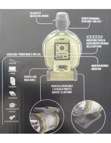 • Luminosità: Alta intensità 850 lumen/Luce diffusa 360° 220 lumen