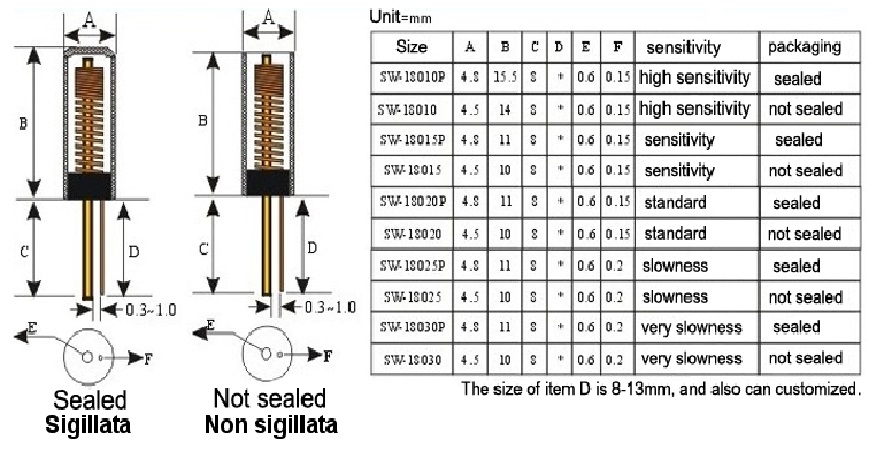SENSORE DI VIBRAZIONE E TILT N.O. ad alta sensibilità. SW-18010P