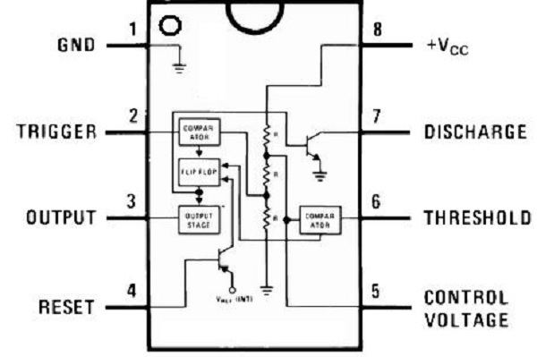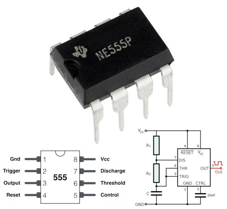 L'NE555 è un circuito integrato che può essere configurato come Multivibratore monostabile (timer), come astabile (oscillatore) e come bistabile (flip-flop) permettendo la realizzazione di numerosissime applicazioni diverse. Questo circuito integrato è stato inventato e progettato da Hans R. Camenzind nel 1970 e introdotto nel mercato nel 1971 dalla Signetics (successivamente acquisita da Philips. Il circuito interno di questo integrato è formato da 23 transistori, 2 diodi e 16 resistori che compongono, oltre al già citato partitore per ottenere le tensioni di riferimento, due comparatori, un latch SR e uno stadio di potenza per pilotare il carico. Il formato più comune del 555 è in contenitore plastico a 8 pin DIP, ma esistono versioni in contenitore metallico e in vari contenitori SMT. Esistono anche numerose varianti del circuito base: oltre alle varie versioni CMOS a basso consumo (in cui i partitori di tensione sono realizzati con resistori da 100 kO anziché da 5 kO[2]) esiste l'NE556, che è composto da due NE555 nello stesso contenitore (in questo caso DIP a 16 pin), e l'NE558 che è, invece, formato da 4 unità con connessioni e caratteristiche leggermente diverse dall'NE555.