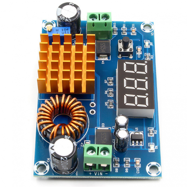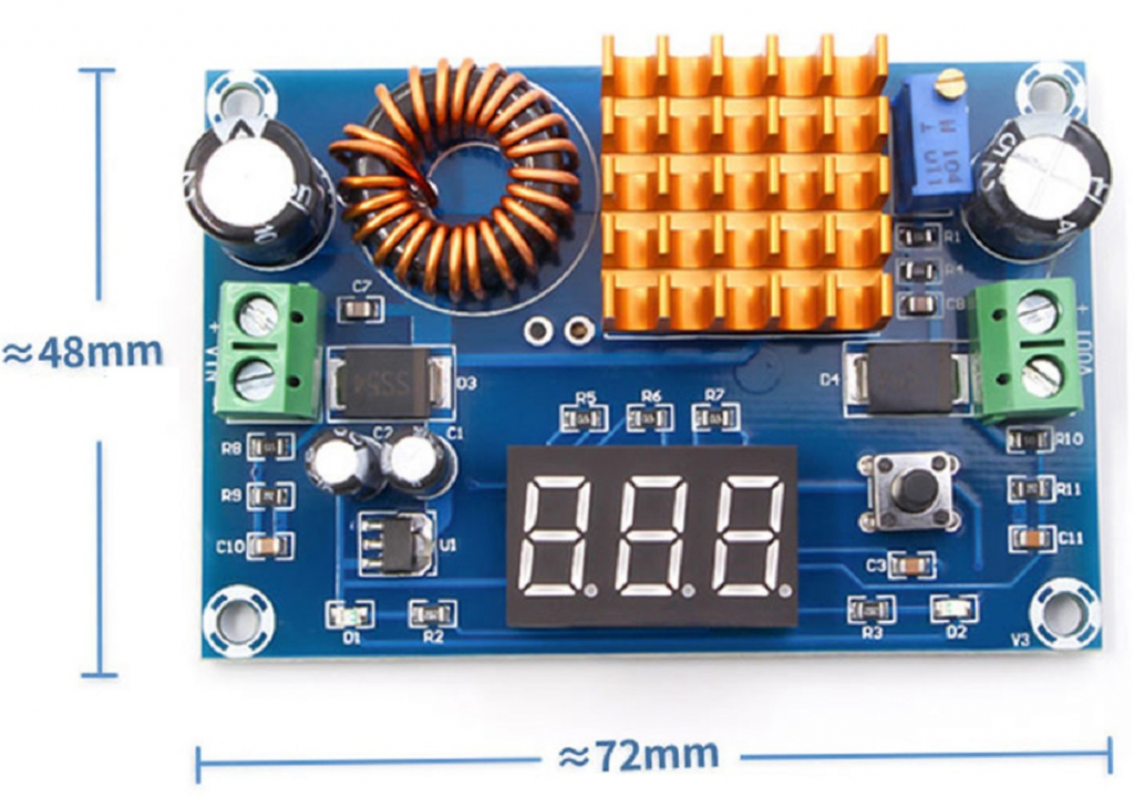 Modulo convertitore DC-DC step-up da 3-35V a 5-45V di alta precisione con dissipatore in alluminio. Il trimmer ad alta precisione permette una regolazione fine della tensione in uscita. Il display a bordo può indicare la tensione di uscita con una precisione di +/- 0,1V. Il pulsante consente di alternare la visualizzazione delle tensioni di entrata e uscita, indicati tramite i LED D1 e/o D2.