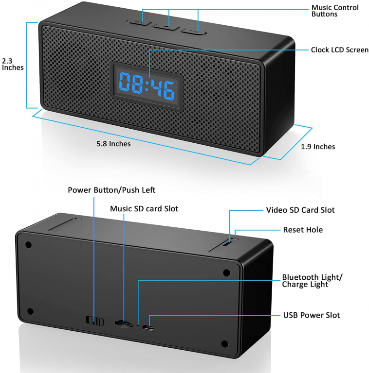 Speaker bluetooth con app per cellulare. Telecamera nascosta con altoparlante, ha funzioni avanzate di rilevamento del movimento e visione notturna. Quando viene rilevato un movimento, la spycam registrerà automaticamente video e/o scatterà foto. 8 LED per la visione notturna ad infrarossi integrati. Al buio, è possibile attivare manualmente la funzione di visione notturna.