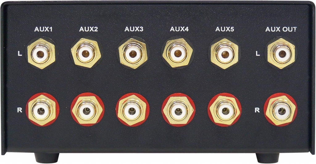 Caratteristiche principali Dynavox AUX-S - Commutatore di prolunga in ingresso in metallo con 5 ingressi RCA, per amplificatori stereo e surround, colore: Nero