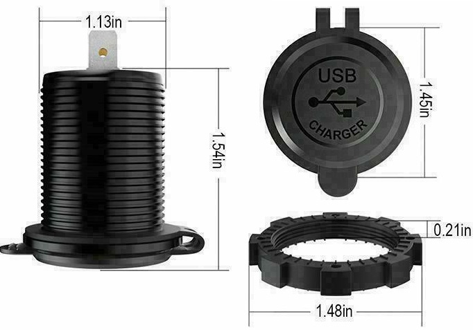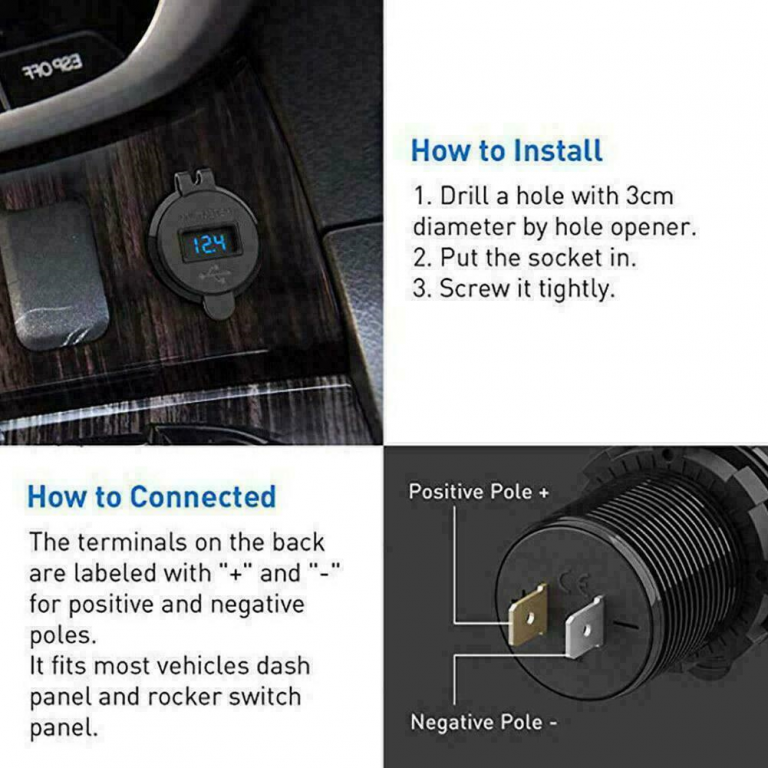 Presa USB molto facile da installare in 10 minuti: sono indicati i poli "+" e "-" non c’è bisogno d’altro. Può anche essere collegato ad un interruttore on/off per risparmiare energia quando non utilizzato perché consuma comunque 30 mA per i led ed il convertitore DC-DC interno.