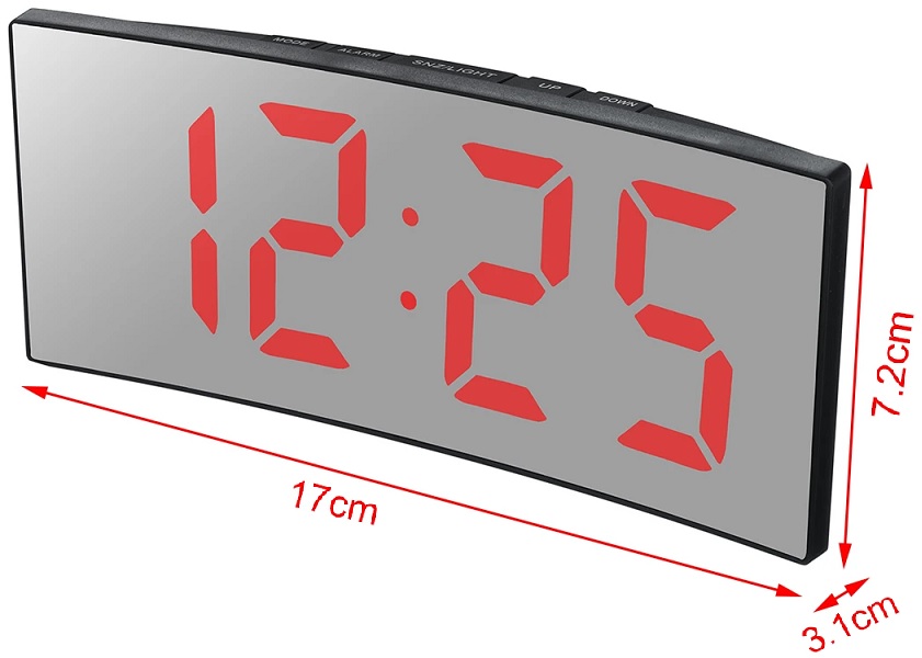 Orologio sveglia elettronica di alta qualità dal design moderno, a LED di grandi dimensioni ed alta luminosità. con ampio display curvo, consente di vedere l'ora in modo più chiaro.anche di giorno con molta luce. Al buio la luminosità si adatta alla luce ambiente.