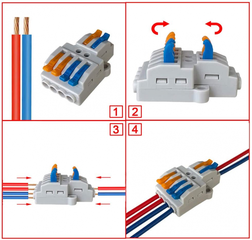 Vantaggio: ?Adatto a una varietà di dimensioni dei fili. ?Plug and play connessione rapida. ?Punto di test integrato. ?Connessione esente da manutenzione. ?Bassi costi di installazione e funzionamento sicuro. ?La leva di comando evita la necessità di attrezzi. ?La temperatura di servizio continuo massima è di 105°C. ?È possibile combinare diverse dimensioni e tipi di cavi in un unico connettore. ?Resistenza alla corrosione, resistenza alle alte temperature e resistenza all'invecchiamento. ?Connettore filo compatto conduttore riutilizzabile.