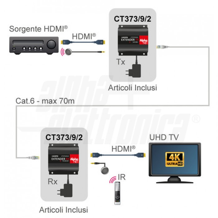 L'extender CT373/9/2 é adatto per estendere la lunghezza dei cavi HDMI utilizzando un solo cavo Cat.6. In questo modo è possibile la trasmissione a distanze notevoli senza degradazione di segnale. E' la soluzione ideale per uso domestico e show rooms, applicazioni legate alla sicurezza, sale conferenza, scuole e ambienti di training.