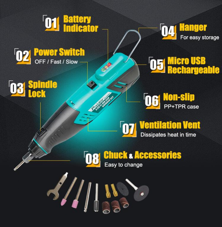 Accessorio: cavo USB, Chiave, Ø2.4 millimetri pinza, Ø 3.2 millimetri Pinza (Montato nel corpo), Mandrino per la levigatura band, Mandrino per il taglio Ruota, 8pcs bit assortimento |