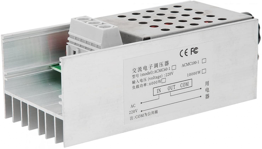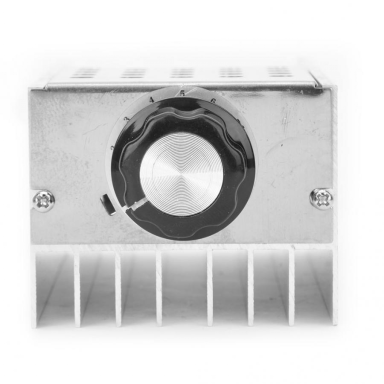 Modulo regolatore di velocità per motori elettrici 10-220Vac, può regolare anche la luminosità di fari a filamento fino a 10KW. (Dimmer). IL CARICO DEVE ESSERE COLLEGATO PRIMA DI PROCEDERE CON LA REGOLAZIONE. Questo dispositivo viene utilizzato prevalentemente con carichi resistivi come lampade ad incandescenza, Forno elettrico, scaldabagno, ferro da stiro, caloriferi con resistenze a filo, ecc. In caso di carichi induttivi come motori, elettrocalamite ecc si deve considerare una potenza in uscita di circa 1/3 rispetto al carico resistivo. Funziona con quasi tutti ii tipi di motore in alternata, monofase. Ma per alcuni motori (solo una minoranza) non è garantito un funzionamento ottimale.