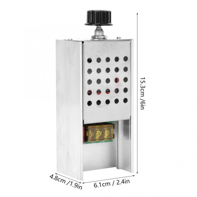 Tensione ingresso: 110-220 Vac Tensione uscita: 10-220 Vac Potenza max: 6000 W (Carico Resistivo) Efficienza: >92% Dimensioni: 130X60x47 mm Peso articolo 100 grammi Manopola con Foro di fissaggio da 6mm