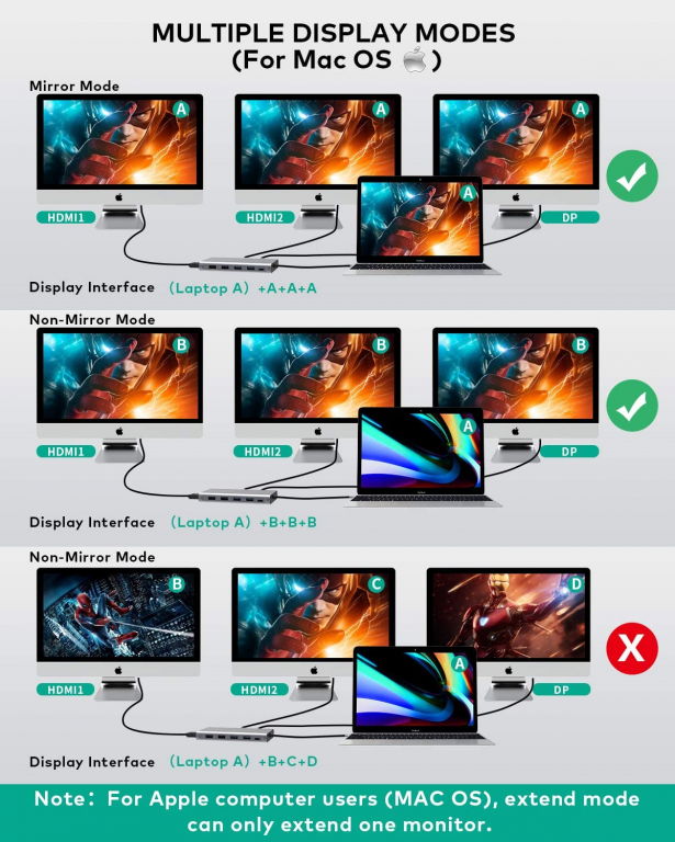 - Display triplo e 4K ad alta risoluzione: 2 porte HDMI e 1 DP supportano 3 monitor risoluzioni fino a 4K @ 30Hz sul sistema Mac OS contemporaneamente. I sistemi Windows supportano risoluzioni a doppio display fino a 4K @ 60Hz o tripla risoluzione fino a 1080P. La porta DP rende il display e la trasmissione audio del triplo monitor più chiara e stabile. Nota: l'uscita del laptop deve supportare DP1.4.