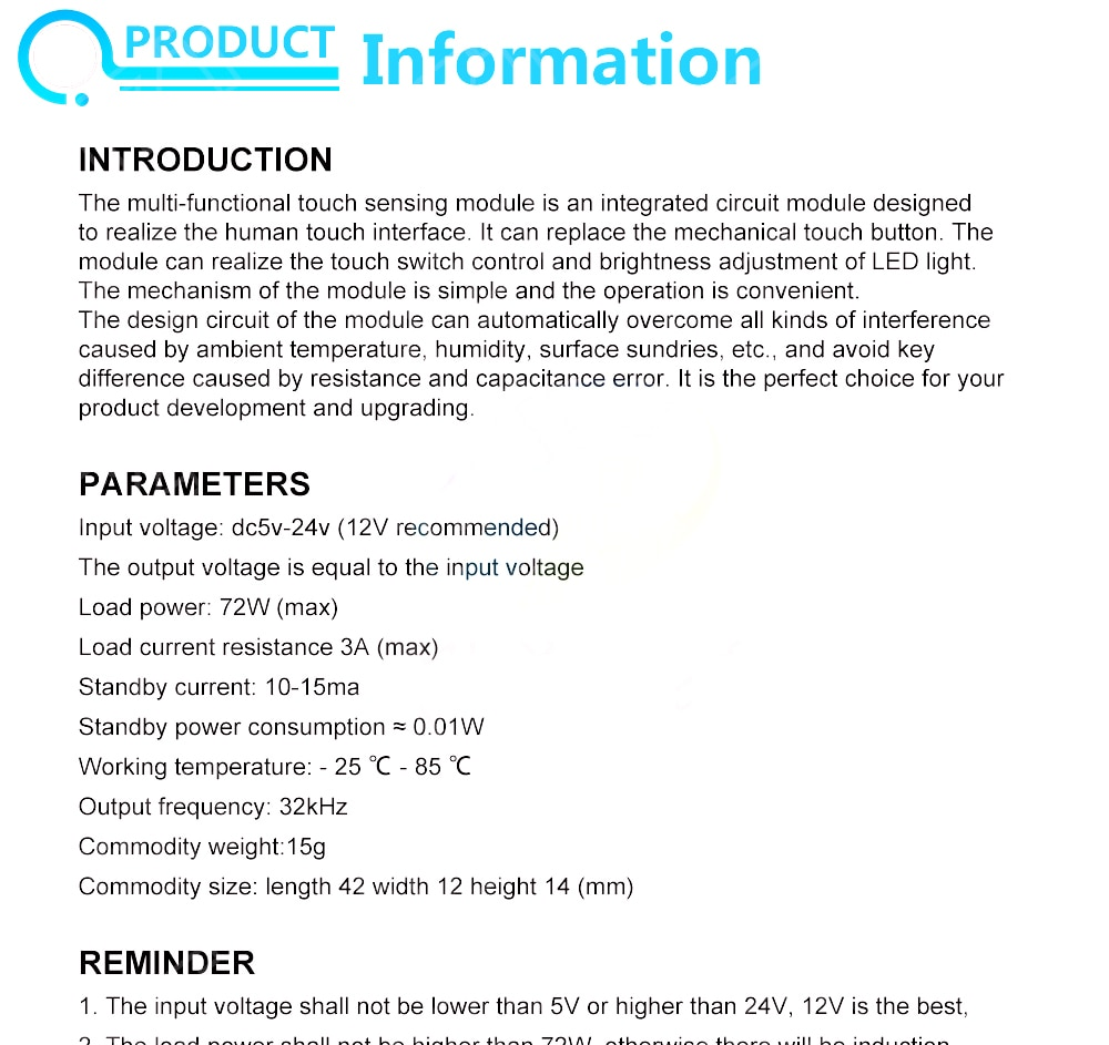 MODULO DIMMER TOUCH PER BARRE LED SWITCH 9-24VDC 3AH 30W