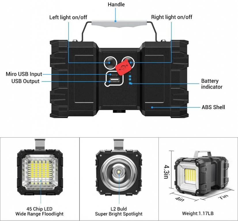 Incize 3 + 4 luci modesefi3-faretto a LED ricaricabile entrambe le teste possono facilmente passare tra le modalità di luminosità di media e media potenza con un clic. Luce di emergenza, la modalità SOS delle luci stroboscopiche rosse/blu può essere utilizzata per l'assistenza esterna.