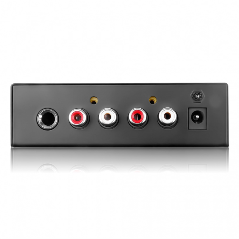 Preamplificatore phono di dimensioni compatte con guscio in metallo, portatile e durevole.