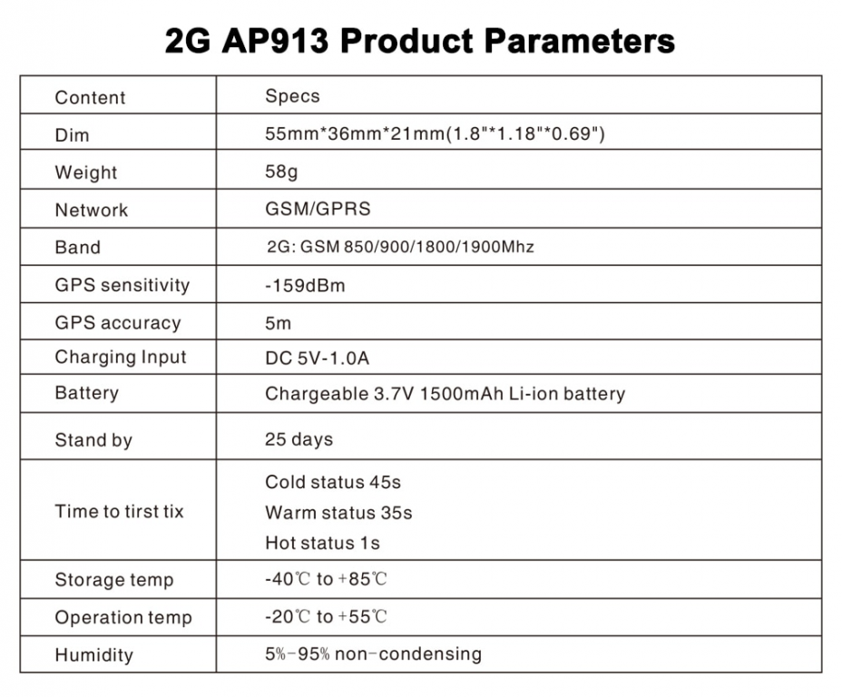 Questo mini tracker gps impermeabile tkstar AP913 è un localizzatore gps 2g/GSM che funziona sulla base delle reti 2g GSM / GPRS esistenti e dei satelliti gps, può trovare e monitorare qualsiasi obiettivo da remoto tramite SMS, app mobile e per il monitoraggio online senza restrizioni sul monitoraggio a distanza! Adotta la tecnologia gps più avanzata e il doppio posizionamento LBS. In aggiunta, con un potente magnete integrato, può essere installato molto facilmente e saldamente su un'auto, un camion e qualsiasi bersaglio con interfaccia metallica. In aggiunta, questo tracker AP913 è un localizzatore gps completo progettato per un'ampia gamma di applicazioni di localizzazione dei veicoli. È supportato da un caricabatteria da auto cablato rigido opzionale che fornisce alimentazione esterna continua. Il ricevitore gps integrato ha un'eccellente sensibilità e un tempo veloce per la prima correzione. Il suo sistema quad-band gprs / GSM supporta 850/900/1800/1900 MHz che consente di controllare la posizione di TK105A's in tempo reale o di monitorarlo regolarmente dal server interno e dai dispositivi mobili in tutto il mondo! L'integrazione del sistema è semplice, in quanto viene fornita una documenti completa per il protocollo gprs-link. Nel protocollo di comunicazione Gprs supporta un'ampia gamma di rapporti, tra cui passaggi di confine di emergenza, geo-aspirazione, batteria scarica, allarme a percussione e posizione gps programmata.