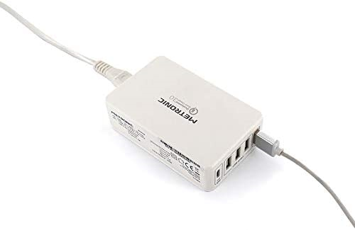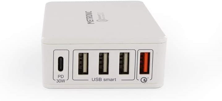Con il caricatore intelligente USB a 5 porte METRONIC, puoi caricare contemporaneamente più dispositivi USB (fino a 5 dispositivi). Grazie al suo sistema di protezione intelligente, consente la ricarica senza il rischio di surriscaldamento, sovraccarico o cortocircuito. Sei di fretta, la porta Quick Charge è lì per recuperare energia velocemente. Hai il tempo, carica in modo ottimale più dispositivi contemporaneamente con le 3 porte Smart IC. Finalmente hai un dispositivo dotato di presa USB Type C, sprigiona tutta la potenza con la porta Type C "Power Delivery" da 30W.