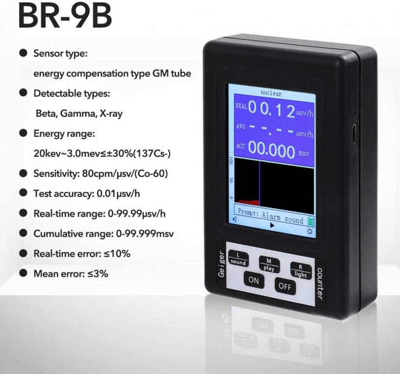 Specifiche tecniche: Materiale: ABS. Modello: BR-9B Dimensione dello schermo: 57 * 43mm / 2.2 * 1.7in Tipo del sensore: Tipo di compensazione energetica Tubo GM Tipi rilevabili: Beta, Gamma, Raggi X Gamma di energia: 20kev ~ 3.0mev= ± 30% (137cs-) Sensibilità: 80CPM / µSV / (CO-60) Precisione del test: 0,01µsv / h Intervallo in tempo reale: 0-99,99µsv / h Gamma cumulativa: 0-99.999MSVV Errore in tempo reale: =10% Errore medio: =3% Batteria: batteria 3 * AA 1,5 V o batteria ricaricabile da 3 * 1,2 V (non inclusa) Carica: ingresso USB 5V 2A Tempo di ricarica: =4 ore