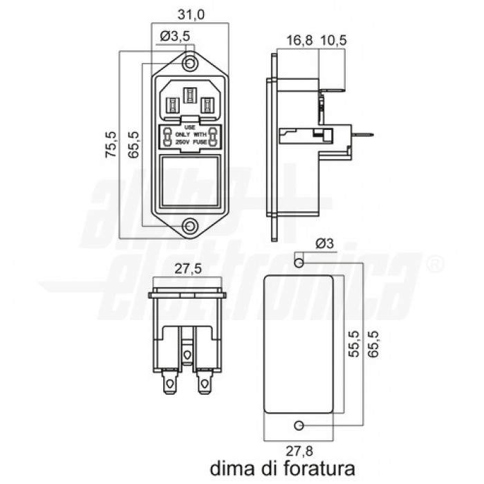 SPINA MASCHIO DA PANNELLO FISSAGGIO A VITE CONTATTI FASTON 4,8MM C8 CON INTERRUTTORE E FUSIBILE