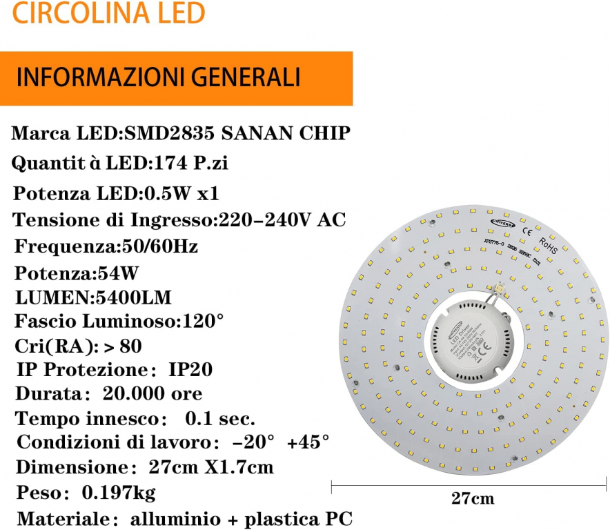 - Tensione ingresso : AC165-265V Angolo luminoso: 180°