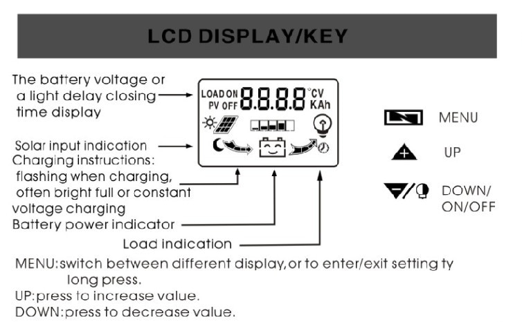 1. Questo controller rileva automaticamente 12 v24v. Durante l'installazione per la prima volta, assicurati che la batteria abbia abbastanza tensione in modo che il controller può rilevare il tipo di batteria corretto.