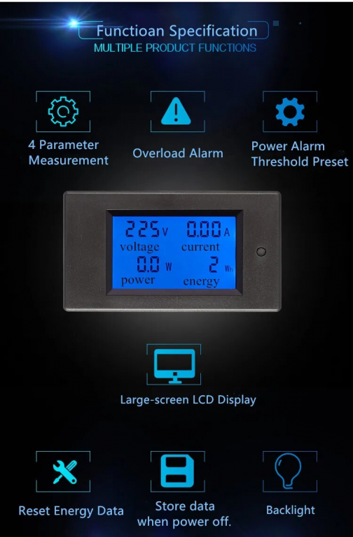 6. LCD a grande schermo (tensione di visualizzazione, corrente, potenza attiva, energia allo stesso tempo)
