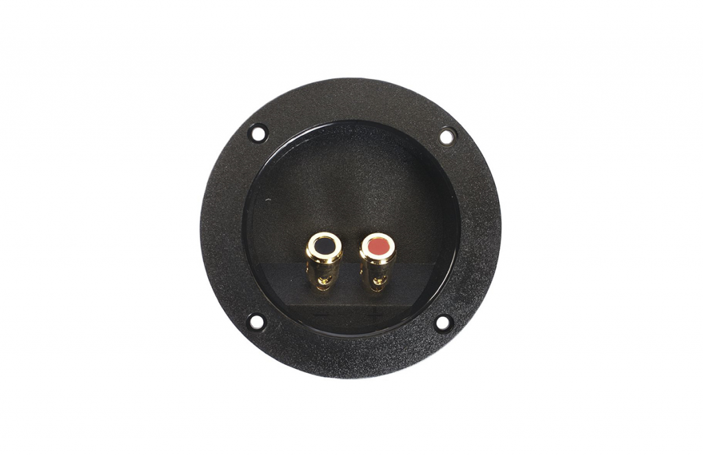 La vaschetta portaterminali Ciare YAC006 è rotonda e costruita in ABS di colore nero. Incorpora due terminali a molla in metallo placcato oro che accettano cavi fino a ø 6 mm. Come di consueto, i due terminali della vaschetta si contraddistinguono grazie al loro colore. Il polo positivo è segnalato con il colore rosso, mentre quello negativo dal colore nero. Questo consente di effettuare le operazioni di cablaggio in maniera rapida, semplice e precisa. I colori minimizzano infatti la possibilità di invertire per errore la polarità elettrica quando si effettua il collegamento tra amplificatore e diffusore.